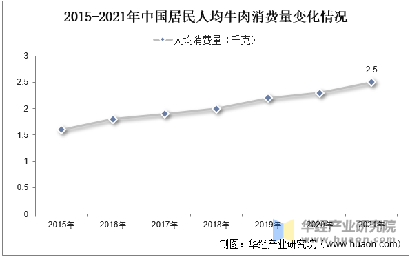 跟着人们的健康认识不竭提高,对于健康饮食的需求也不竭添加,而牛肉因为其丰硕的氨基酸和卵白质而遭到越来越多人的青睐,从而导致需求量不竭添加。从牛肉人均需求量环境来看,近年来我国牛肉人均需求量稳步增加,由2015年的1。6千克/人增加至2021年的2。5千克/人。将来,跟着我国居平易近可安排收入的提拔,牛肉人均消费量将连结增加的态势,为牛肉行业的成长供给强劲动力。