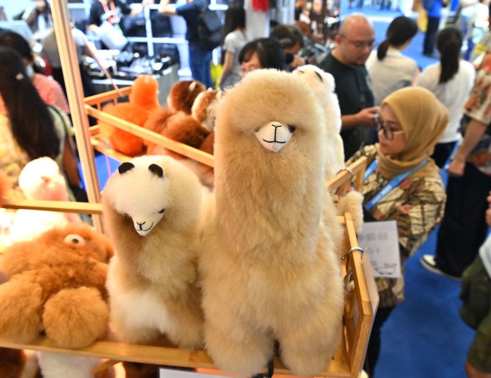 2024年9月28日,不雅众正在中国东盟博览会上挑选秘鲁羊驼毛公仔。(记者 周华 摄)?。