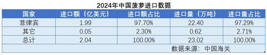 2024年中国进口菠萝23。02万吨,价值2。04亿美元;此中菲律宾占进口额的97。7%,占进口量的97。29%,菲律宾是中国菠萝进口的最大来历国。