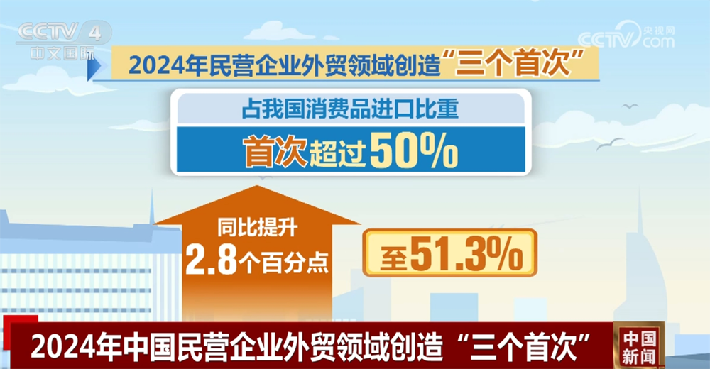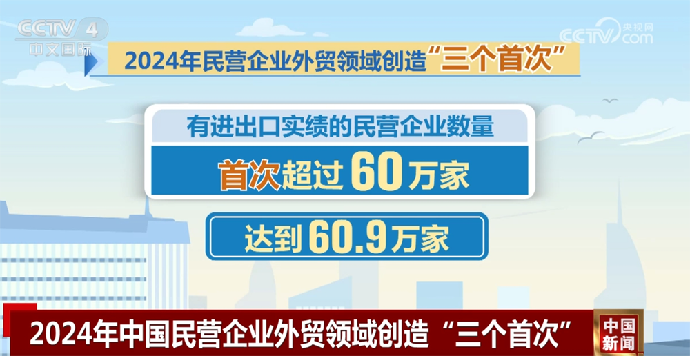 记者从海关总署领会到,平易近营企业已持续6年连结中国第一大外贸运营从体地位。做为外贸“从力军”,客岁,平易近营企业进出口24。33万亿元,同比增加8。8%,占中国外贸总值的比沉提拔至55。5%。此外,客岁平易近营企业正在中国外贸范畴还创制了“三个初次”。